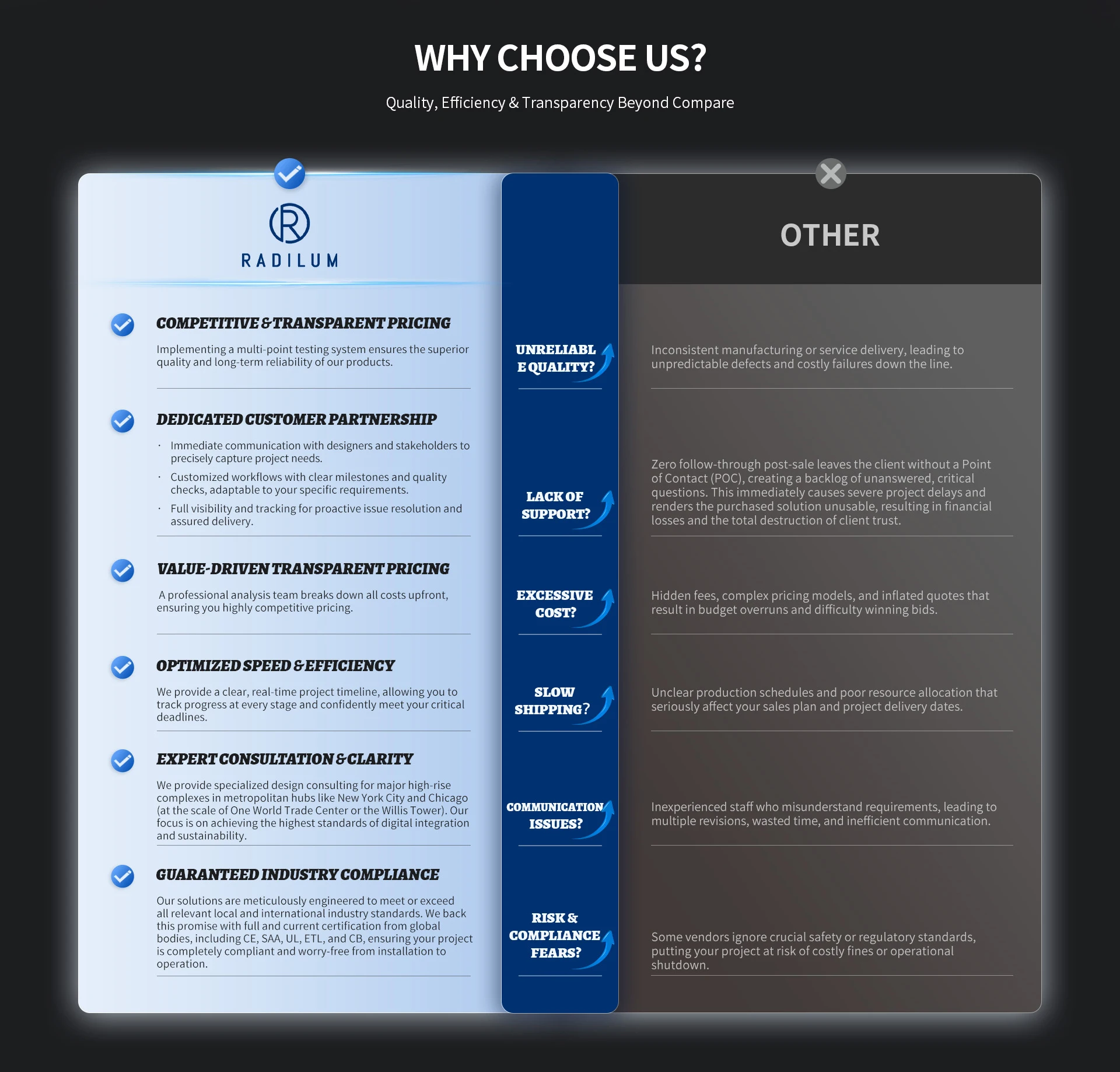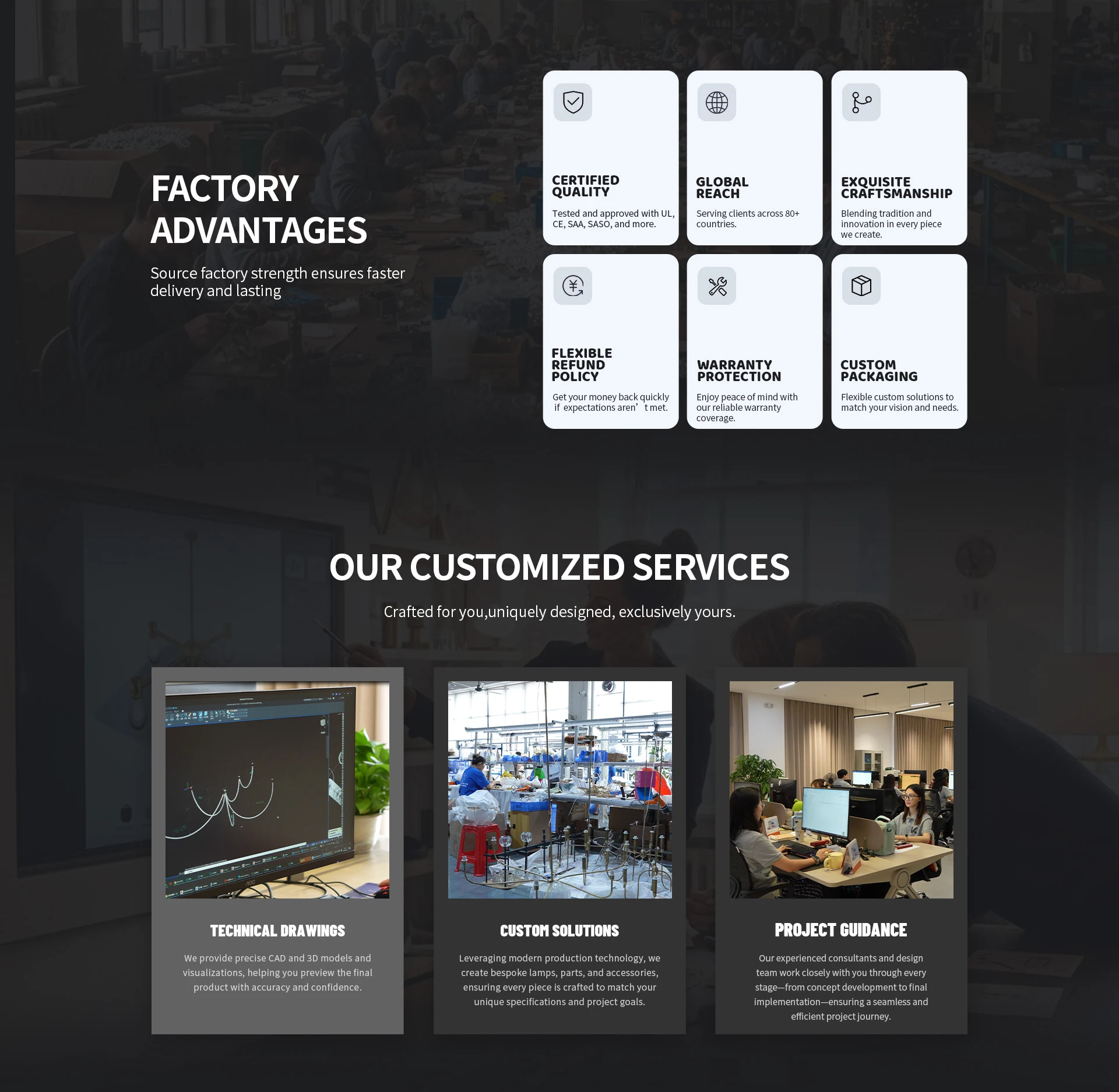 Jiangmen Radilum Lighting Factory, founded in 2010, is a leading indoor lighting supplier integrating trade and manufacturing. With a 100,000 sq.ft. base and 200+ professionals, we’ve served 1,000+ projects and 20,000+ clients worldwide. Our chandeliers, pendants, ceiling lights, and wall sconces are widely used in residential, commercial, and hospitality spaces. Backed by $20M+ R&D, we focus on innovation, quality, and service, exporting to North America, Europe, and Southeast Asia.